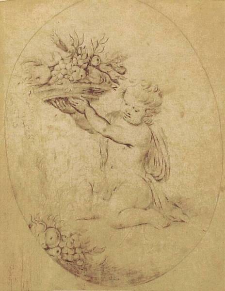 Putto met fruitschaal in ovaal medaillon, voorstellende: de AARDE (Terra), 17de eeuw