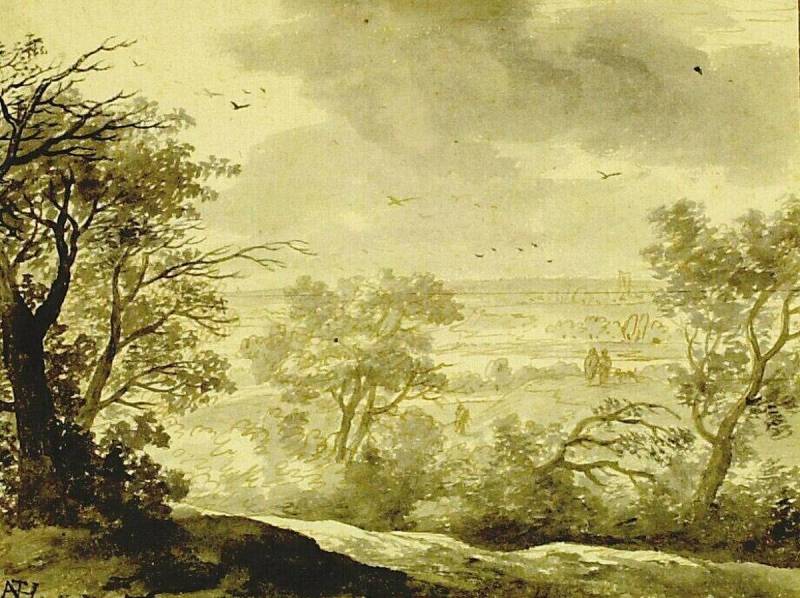 Gezicht over een vlak land vanaf een begroeide heuvel, 1661-1686