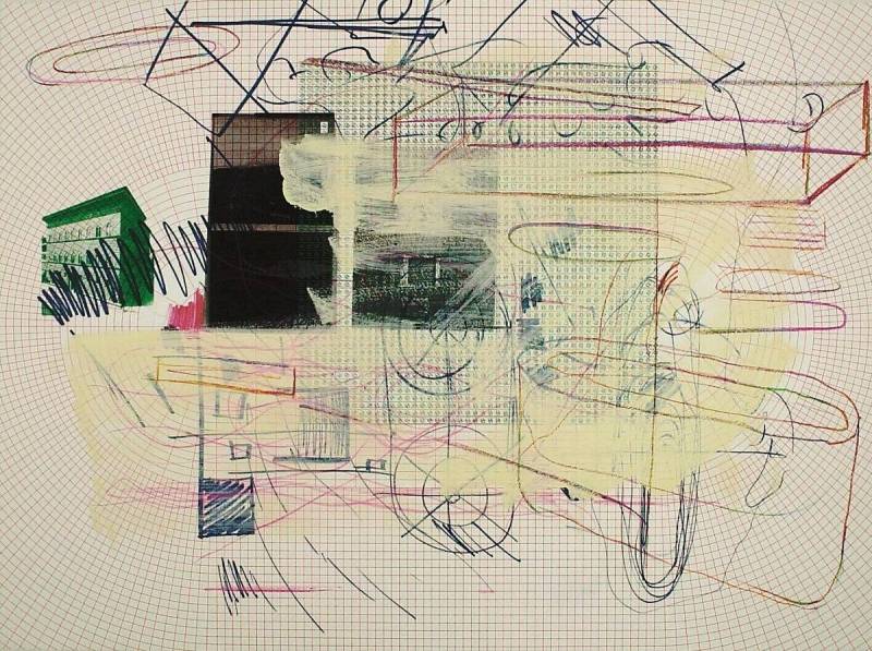 inkt (offset en viltstift), kleurpotlood, krijt en verf op papier