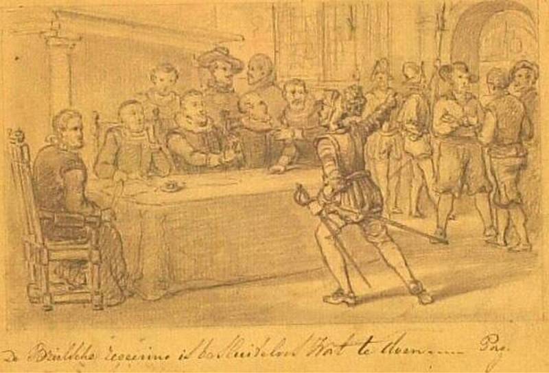 Illustratie van een historisch tafereel uit de 80-jarige oorlog, circa 1850