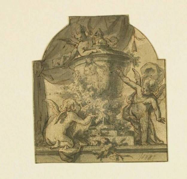 Ontwerp voor een deurstuk met siervaas en drie putti, 18de eeuw