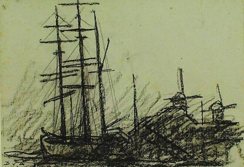 Driemaster met geverfde zeilen met op de achtergrond twee molens, voor 1930