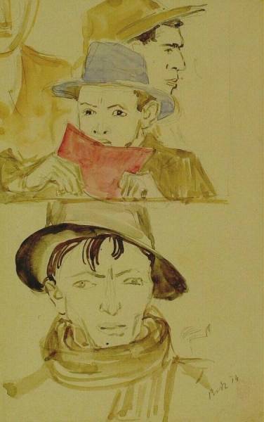 Vier mannenkoppen, een vijfde slechts ten dele zichtbaar, 1914