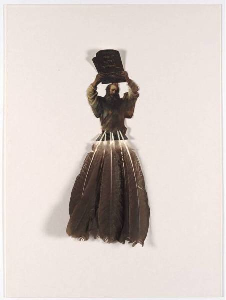 collage met veren en kleurendruk op papier