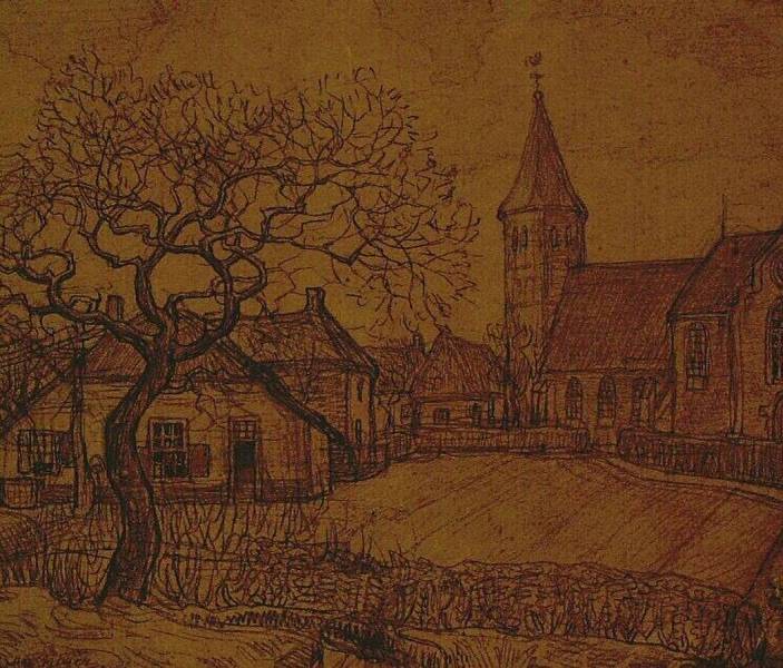 Landschap met een boom, een kerk en huizen, eind 19de - begin 20ste eeuw