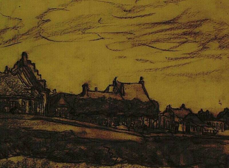 Oude huisjes van een dorp met geschoren boomgroep, eind 19de - begin 20ste eeuw