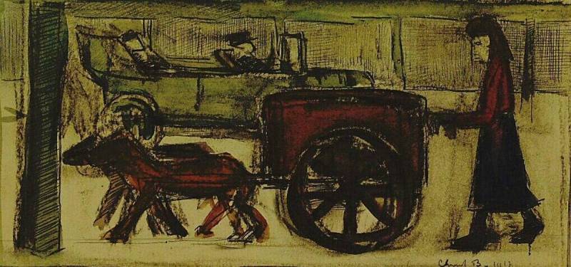 Straatscène: Vrouw met hondenkar en passerende auto, 1917