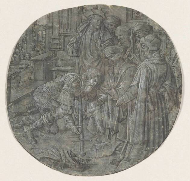 pen en zwarte inkt, gewassen in grijs, wit gehoogd, op grijsblauw geprepareerd papier