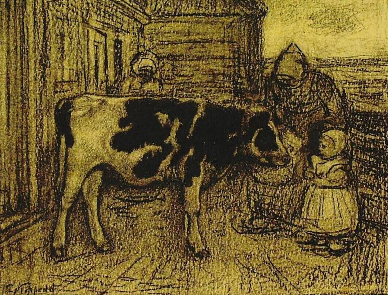 Twee vrouwen met kindje bij een stier, eind 19de - begin 20ste eeuw