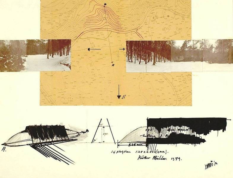 Collage; kleurenfoto's, chromogene op PE papier, gedeeltelijk geplakt op topografische kaart gedrukt met 4 verschillende kleurenviltstiften betekend. Gedeeltelijk op secundaire drager (watermerk H.T.S.). Met lijm bevestigd, waarschijnlijk rubbercementachtige lijm. Onderste deel secundaire papier betekend met met viltstift en potlood op papier. Secundaire drager is met lipjes van Japans papier op onderbord gezet.