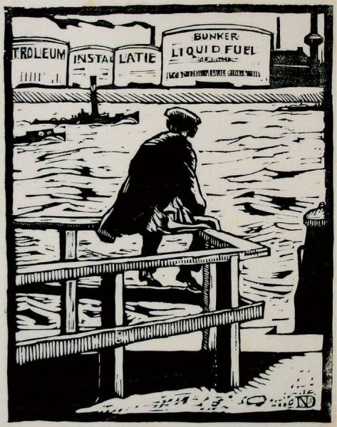 Man op hek aan de haven, eerste helft 20ste eeuw