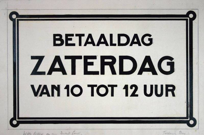 Clichétekening voor houten bordje 'betaaldag zaterdag van 10 tot 12 uur', c. 1910-1920