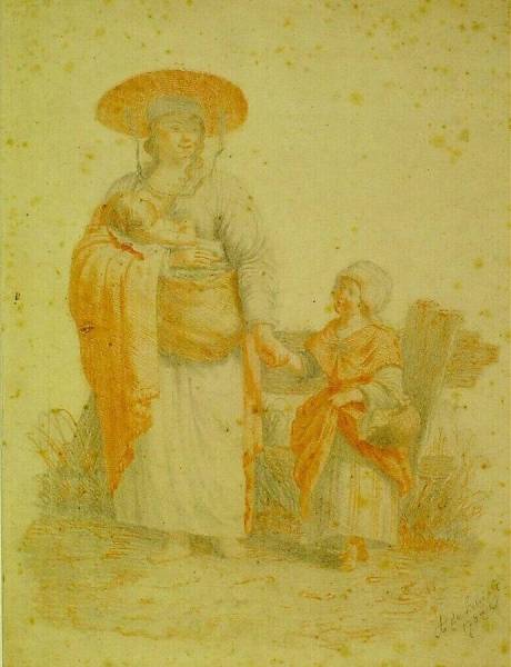 Vrouw met een kind op de arm en een meisje met een mandje aan de hand, 1784
