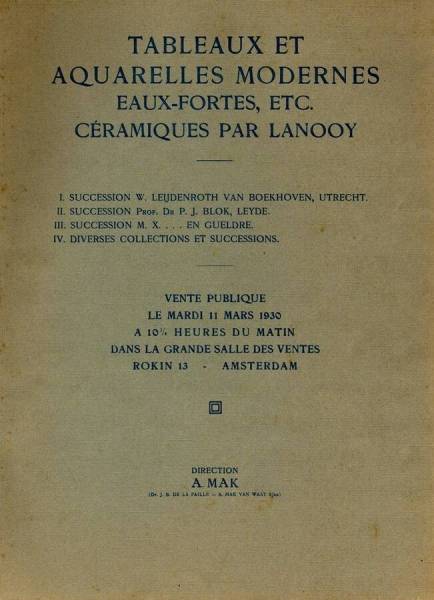 Auction Catalogue Amsterdam (A. Mak) 'Tableaux et aquarelles modernes, eau-fortes, etc. Ceramiques par Lanooy', 11 March 1930