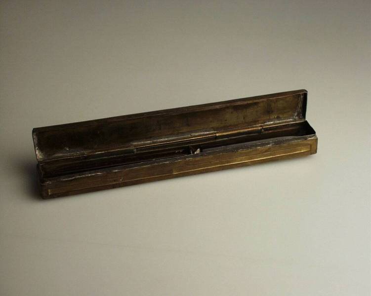 brass, steel, wood, paint; box: brass plate punched-in decoration; scraper steel: forged and ground