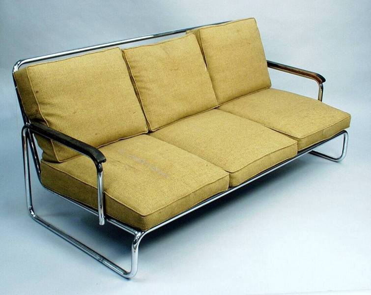 oak wood with metal frame (chromed), cushions upholstered in green woollen fabric