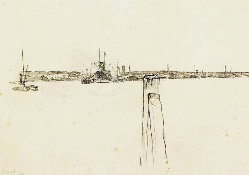 Dukdalf en silhouet van loodsen en schepen, 1911