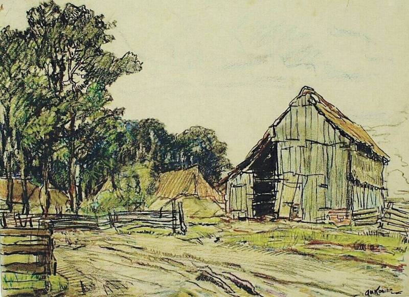 Schuren en boerenwoningen bij geboomte, late 19th - early 20th century
