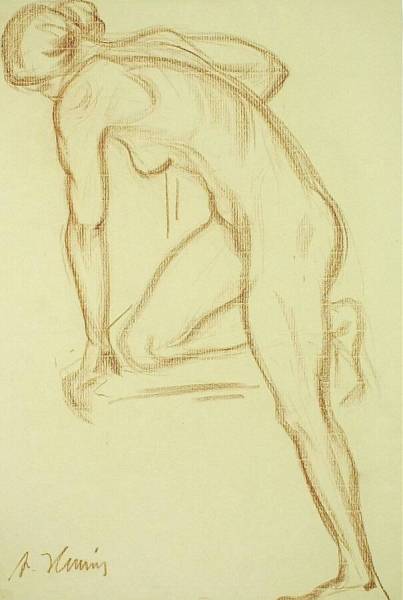 Bukkende vrouwenfiguur met de knie op een bank, early 20th century