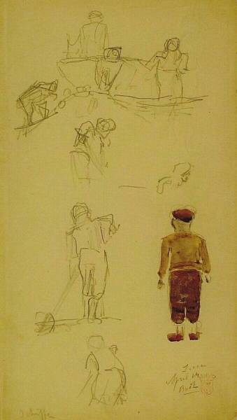 Studie 'Mijnen bij Zaccar, Noord Afrika', staande man op rug gezien, drie schetsen van spittende man, twee figuren en een lorrie, 1914