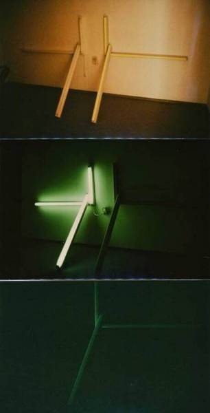 wood, grey paint, paper, fluorescent paint; box: wood, metal, pink lining (silk)