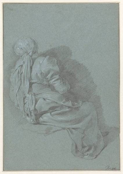 black and white chalk on blue paper; framing lines in pen and brown ink