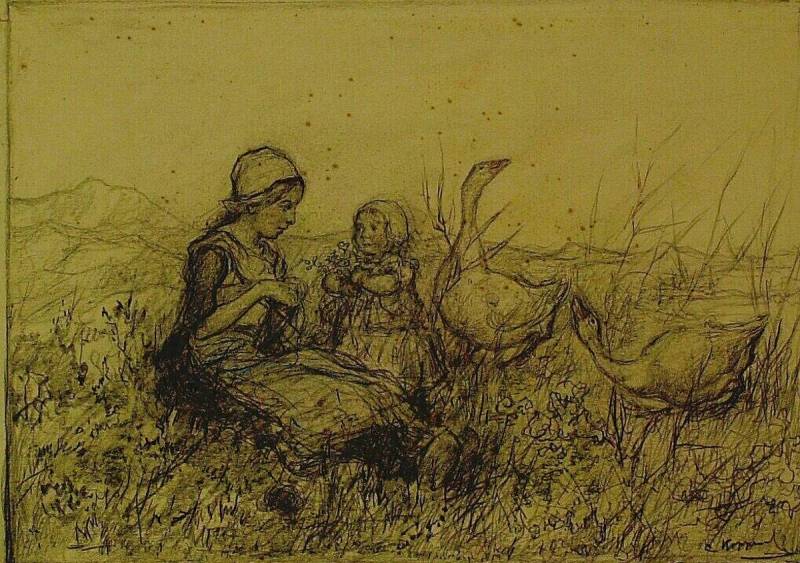 Breiend meisje met ganzen, late 19th-early 20th century