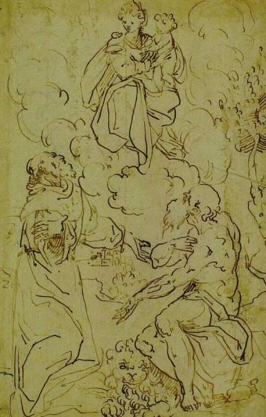 Apparition of Mary with the Christ Child before St Francis (?) and St Jerome