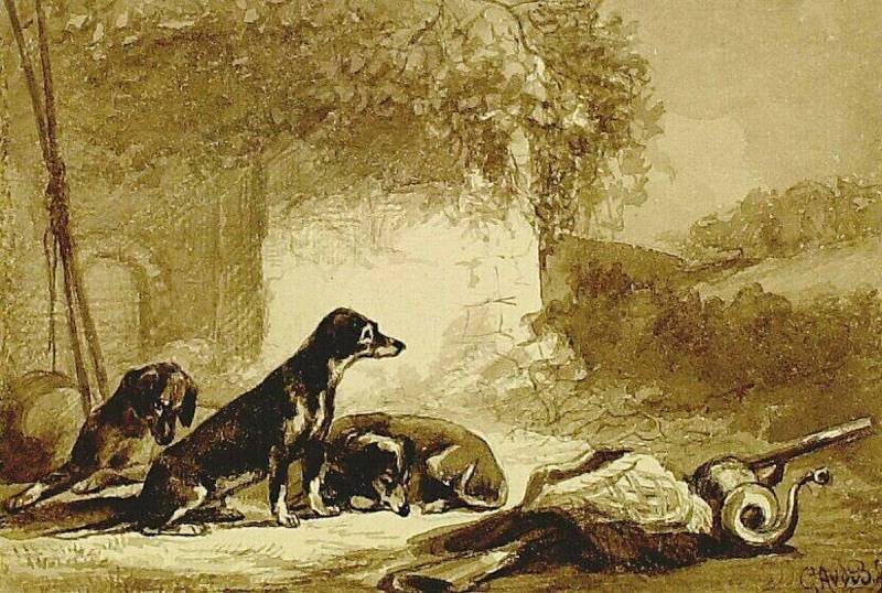 Drie hondjes bij jagersattributen, 19th century