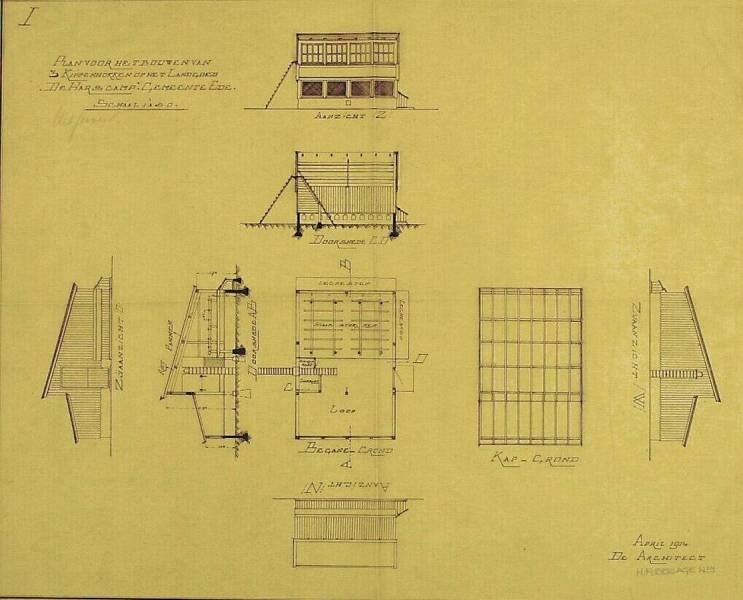 Plan voor het bouwen van 3 kippenhokken op het landgoed 'De Harscamp', Gemeente Ede, April 1914