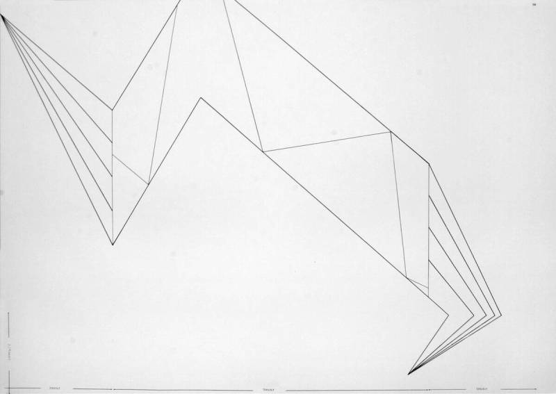 Studie voor 'a way in a room', een installatie gemaakt voor een ruimte van 9 bij 11 bij 3 meter. Materiaal 7 platen staal, 1 ets, 10 lijnen gehakt uit 2 muren, 1981