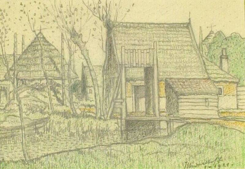 Huisjes met hooiberg aan een sloot, waarover een bruggetje met een poortje, 1921