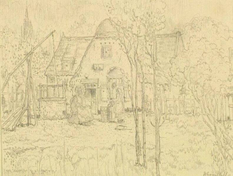 Huisje waarvoor twee figuurtjes (één met nimbus), 1920