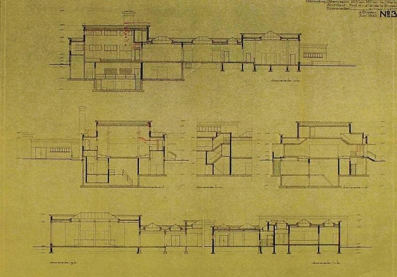 Ontwerp uitbreiding Rijksmuseum Kröller-Müller: Doorsneden a-b, c-d, e-f, g-h, i-k en l-m, June 1943