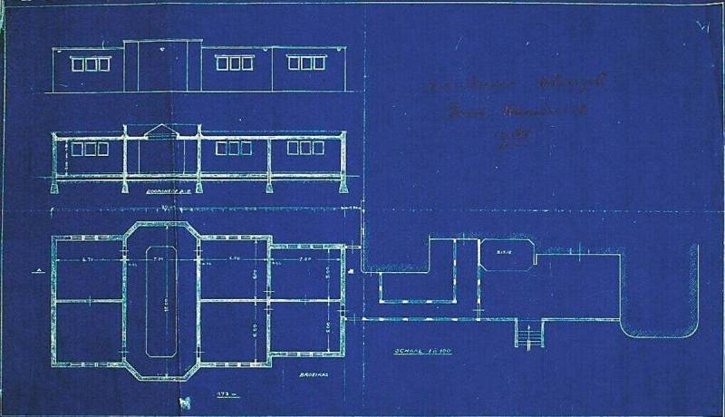 Ontwerp voor een aanbouw/museum: Plattegrond, aanzicht en doorsnede A-B, 1935
