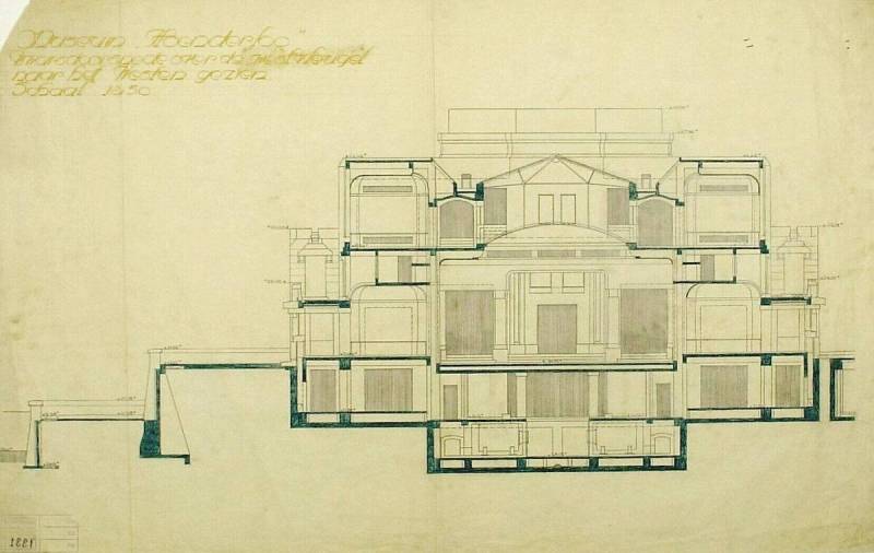 Ontwerp voor het museum bij de Franse Berg: Dwarsdoorsnede over de westvleugel naar het westen gezien, c. 1921-1928