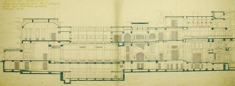 Ontwerp voor het museum bij de Franse Berg: Langsdoorsneede over westvleugel naar het noorden gezien, c. 1921-1928