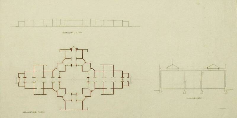 Ontwerp voor het museum bij de Franse Berg: Begane grond, voorgevel en doorsnede, c. 1921-1928