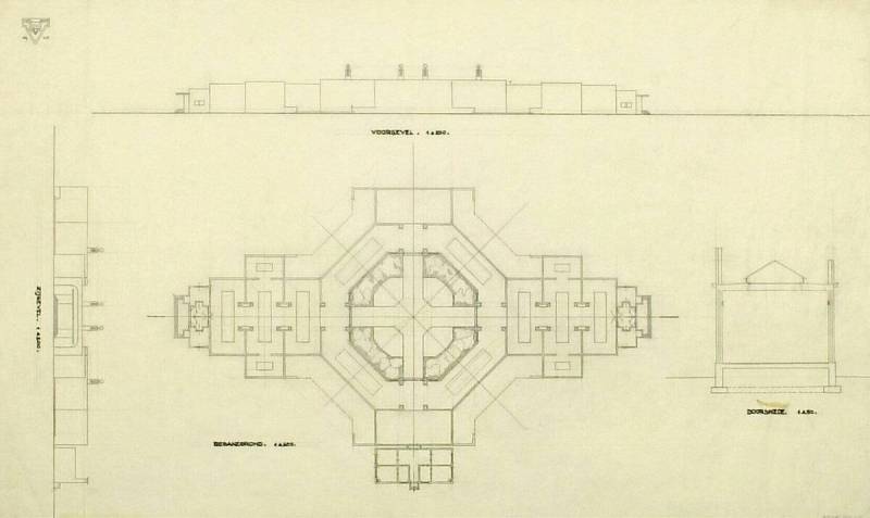 Ontwerp voor het museum bij de Franse Berg: Begane grond, voorgevel, doorsnede en zijgevel, 1925