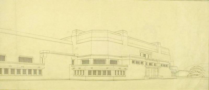 Ontwerp voor het museum bij de Franse Berg: Perspectief (zuid-westgevel), c. 1921-1928