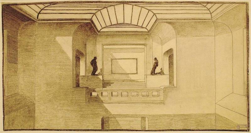Ontwerp voor het museum bij de Franse Berg: Perspectief: doorkijk over een vide heen naar een opgang met treden naar een zaal, c. 1921-1928