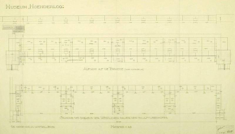 Ontwerp voor het museum bij de Franse Berg: Zicht op het terras (zonder bestrating) / grondplan van de basis van de westelijke muur van het 'Skulpturenhof', 4 August 1927