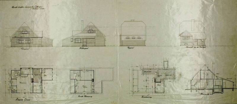 Vier aanzichten, Fundeering, Begane-Grond, Eerste Verdieping en Doorsnede a-b, date unknown