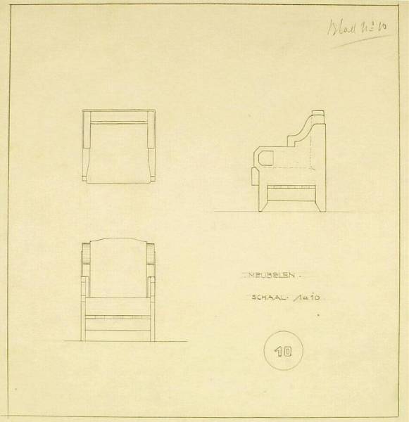 Meubilair voor het grote museum: stoel: op-, voor- en zijaanzicht, date unknown