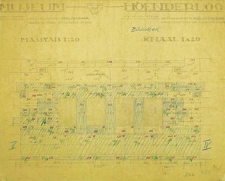 Ontwerp voor het museum bij de Franse Berg: Zuidzijde, buitenmuur bibliotheek, aanzicht van de schuine hoek, 8 December 1921
