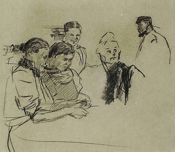 Studieblad met vier koffiepiksters aan een tafel; rechts: een man in profiel,naar links gekeerd. Op de achtergrond links: een koffiepikster en twee (?) koppen, 1893-1894