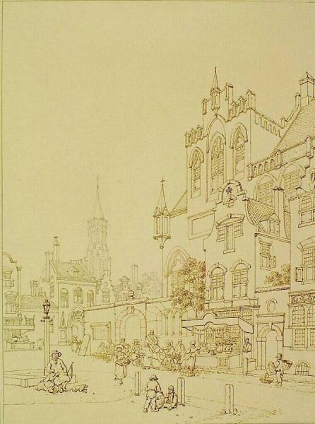Gezicht op een stadsplein met een hoge toren op de achtergrond, early 19th century