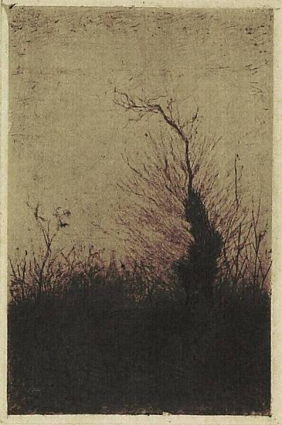 Een zeer fijn vertakt kaal boompje tussen kreupelhout, late 19th - early 20th century