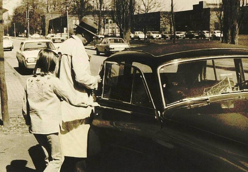 Joseph Beuys bij het gedenkteken van trofeeën in Kleef, 1976