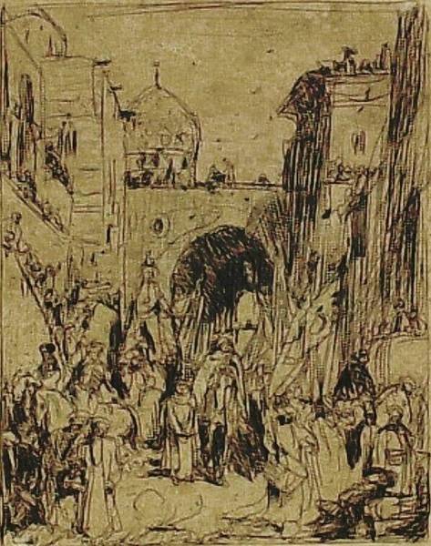 Stadstafereel met ruiter, poort op achtergrond, late 19th - early 20th century